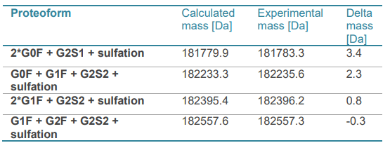 The TRD algorithm allows for the accurate identification of each subunit (Figure 5). The LC1 (observed mass at 36832.6 Da) and Fab (HC2) (observed mass at 24669.7 Da) subunits were identified with excellent mass accuracy that was lower than 0.1Da (Figure 5 and Table 4). The Fab HC1 (CODV) subunits with or without sulfation were identified, with the sulfated species being the major form detected at 42485.8 Da (Figure 5 and Table 4). For the LC2 subunit, 10 N-linked glycoforms were detected, and most of them were sialylated. G2S2, G2S1, G3S3, and G2FS2 are the major glycan species observed. Despite the co-elution between Fc/2 (1) and Fc/2 (2), an accurate identification was achieved, indicating G0F and G1F as the predominant glycoforms for both subunits. The results were consistent with intact mass analysis. As such TRD is the optimal solution for analyzing samples with complex chromatography.