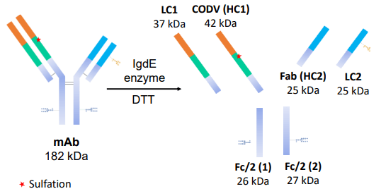 Sample preparation: For intact analysis, the tri-specific mAb sample was diluted to 1 mg/mL and subjected to LC-MS analysis. For subunit analysis, site-specific digestion was performed above the hinge region with IgdE (FabALACTICA, GenovisAB). For digestion, 1 unit of enzyme per μg of mAb was added and incubated at 37°C overnight. The IgdE-digested mAbs were denatured and reduced with 30mM dithiothreitol (DTT) with 5M guanidine hydrochloride for 30 min at 37°C.