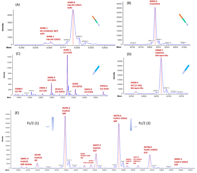 The observed mass of the mAb was 80 Da higher than the expected molecular weight based on the sequence, indicating the existence of either 1 phosphorylation or 1 sulfation. Additional subunit analysis (see next section), peptide mapping experiments and binding assays revealed that this tri-specific mAb contains 1 sulfation on HC1, which affected its binding to the antigen (data not shown). As seen in Figure 3C, multiple glycoforms were detected for the tri-specific mAb, which highlights its increased complexity. Since different glycan combinations can result in the same mass shift on the intact level, the glycosylation profile was further verified with subunit analysis.