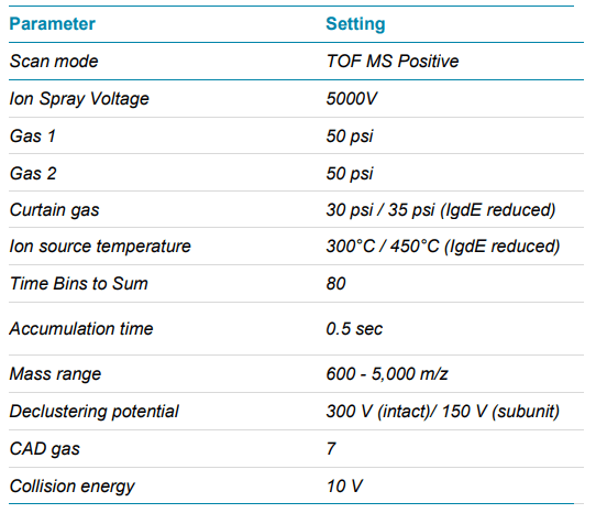Mass spectrometry: A SCIEX X500B QTOF system was used for data acquisition. Data were acquired using TOF MS mode with the intact protein mode turned on. Detailed MS parameters are listed in Table 2.