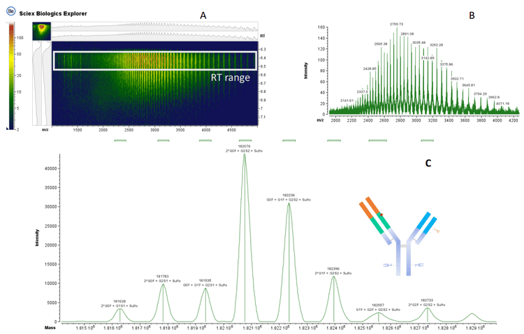 A comprehensive characterization was performed to fully evaluate the molecular integrity and composition of the tri-specific mAb. The molecule was analyzed in its glycosylated intact state. The raw data was inspected with an ion map (Figure 3A) and raw TOF MS spectra (Figure 3B), and the reconstructed spectra (Figure 3C) were analyzed using the theoretical mass information (Table 3).