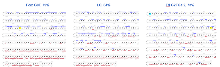 - High sequence coverages ranging from 70% to 85% were obtained for the Fc/2, LC and Fd subunits consistently between injections or across multiple protein therapeutics