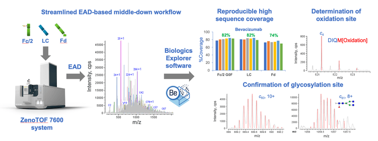Sequence confirmation and PTM analysis are essential for the comprehensive characterization of therapeutics to ensure drug safety and efficacy. 1 Middle-down mass spectrometry (MS) combines the advantages of bottom-up and top-down approaches and offers high sequence coverages of protein therapeutics following a simple sample preparation. 2-4 Traditionally, a middle-down workflow requires extensive method development and often involves multiple fragmentation techniques and/or injections to obtain high sequence coverage. This challenge can be addressed using a single-injection, EADbased middle-down workflow. 5 This streamlined workflow provided consistently high sequence coverage of NISTmAb subunits, enabling sequence and PTM confirmations. 5