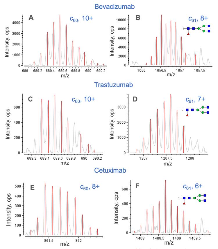 The EAD-based middle-down workflow was used to confirm the location of N-linked glycosylation in the Fc/2 subunits of all mAbs and the Fd subunit of cetuximab. Figure 6 shows the signature fragments (c60 and c61) generated for the Fc/2 subunits of bevacizumab, trastuzumab and cetuximab for the localization of G0F. The detection of non-glycosylated c60 and glycosylated c61 ions confirmed the glycosylation of Asn61 (Figure 6). The detailed characterization of N-linked glycosylation in Fc/2 and Fd subunits of cetuximab will be described in a separate technical note.