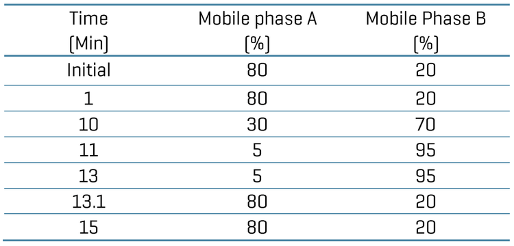 IP-RP LC separation: Oligos were separated based on IR -RP chromatography using a Phenomenex Biozen Oligo LC column (2.6 µm, 50 x 2.1 mm) installed on a Nexera XS inert HPLC system (Shimadzu). The separation was performed using the gradient shown in Table 1 with a column temperature of 60°C and a flow rate of 0.3 mL/min. Mobile phases A and B are water and methanol/water (1:1 v/v), respectively, with 50 mM 1,1,3,3,3-hexafluoroisopropanol (Sigma -Aldrich) and 15 mM diisopropylethylamine (Sigma -Aldrich).