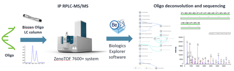 - A streamlined IP-RP LC-MS/MS workflow was developed for comprehensive oligo sequence analysis, leveraging the optimized DDA method with custom dynamic CEs using the ZenoTOF 7600+ system or the ZenoTOF 8600 system and the intuitive oligo sequencing workflow from Biologics Explorer software.