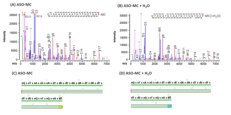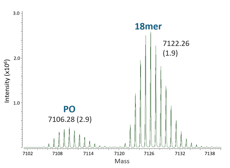 Sample preparation: A synthetic oligo 18mer with full phosphorothioate (PS) linkages was purchased from Integrated DNA Technologies (IDT). An antisense oligo (ASO) 20mer with a maleimide C2 linker (ASO-MC) on the 3’ endwas ordered from VectorBuilder.A stock solution of 1 mg/mL was prepared for 2 oligos. This solution was diluted to 10 ng/ µL, from which 5 µL (50 ng) was injected for LC -MS analysis.