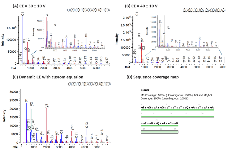 - Compared to fixed CEs with spread, the custom dynamic CEs provided balanced fragmentation of oligos in different charge states, leading to high-quality MS/MS spectra and complete sequence coverage of the oligos.