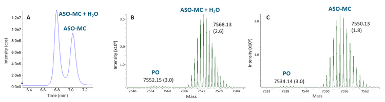 Figures 4 and 5 show the deconvolution spectra of the 18mer and ASO-MC, respectively. High mass accuracies (<5 ppm) were obtained for the intact forms of these 2 oligos and their PO species . The MC linker of the ASO-MC is prone to hydrolysis, leading to the formation of a hydrated (+H2O) species. The Phenomenex Biozen Oligo LC column provided good separation of the ASO-MC and its hydrated species (Figure 5A) for their accurate mass determinations (Figures 5B and 5C).