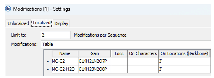 The PS to PO modification was defined for 2 oligos in the Unlocalized tab of the Modifications activity within the sequence candidate generation section of the data analysis workflow (Figure 2). The ASO-MCanalyzed in this work was modified with an MCC2 linker on its 3’ end. The gains of the formula of the linker (C14H21N2O7P) and its hydrated form (C14H23N2O8P) were specified in the Localized tab of the Modification activity (Figure 3).