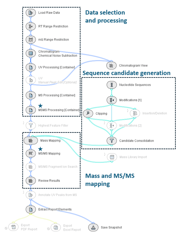 Data analysis: Oligo sequence creation and intact deconvolution of TOF MS data were described previously.3 CID DDA data were processed using an oligo sequencing workflow (Figure 2) within Biologics Explorer software, Version 8.0.3 (SCIEX).