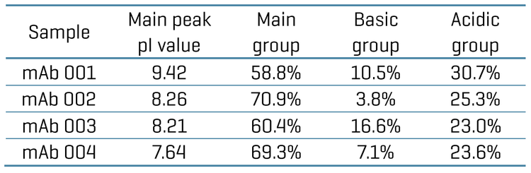 All 4 samples are relatively pure, with little to no detectable impurities observed outside the intact mAb mass range (data not shown). mAb 001 contained approximately 0.5% impurities, including half antibody species within the main peak, as well as clipped and high molecular weight species observed in the acidic region. mAb 002 showed less than 3% impurities, including half antibody species in the basic region and 2 clipping species in the acidic region. mAb 003 exhibited approximately 1% total impurities, primarily consisting of clipped species and clipped variants retaining C-terminal lysine in the acidic region. mAb 004 did not show detectable impurities outside the intact mAb mass range.