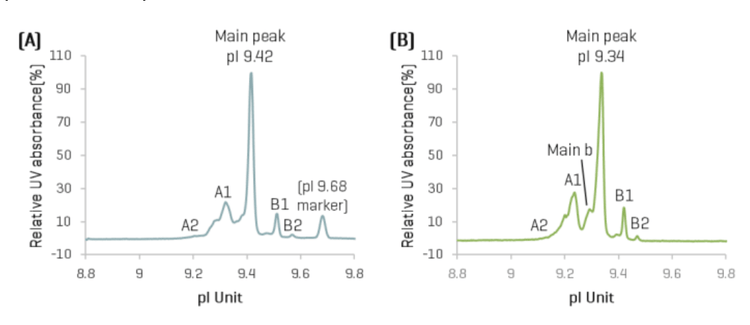 For mAb 001, which has a pI range of 9.0- 9.6, additional matrix optimization was performed to enhance icIEF separation resolution. By adjusting the formulation to a 3:1 ratio of Pharmalyte 8-10.5 and 3-10, improved resolution was achieved. Compared to the icIEF-UV profile generated using the platform method (Figure 3A), the shoulder peak adjacent to the main peak (labeled Main b in Figure 3B) was better resolved with the optimized master mix. The overall profile remained similar between the 2 methods, with only minor differences in the estimated pI values and species composition. The icIEF-MS profiles generated from both methods were comparable (data not shown). All subsequent analyses presented in this technical note were performed using the optimized master mix. These findings demonstrate that a single platform method can substantially reduce method development time while maintaining flexibility for further optimization tailored to specific sample characteristics.