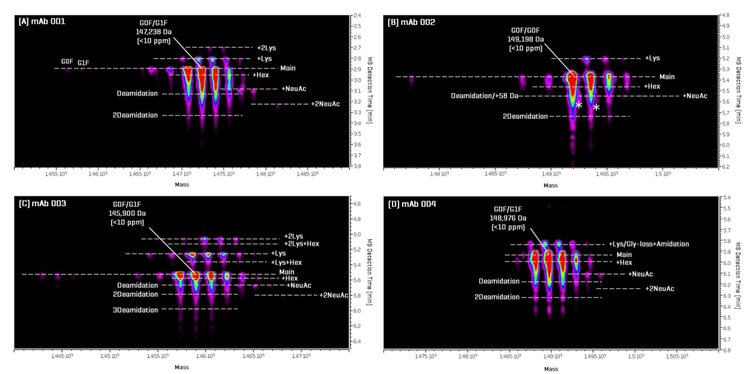 Biologics Explorer software, equipped with a time-resolved deconvolution function, enables scan-by-scan spectral deconvolution and generates deconvoluted mass maps. This capability provides rapid visualization of the overall sample profile and detailed characterization of proteoforms with subtle pI and/or mass differences. Across all 4 mAbs analyzed, mass accuracy was excellent, with the most abundant proteoforms measured within 10 ppm mass error.