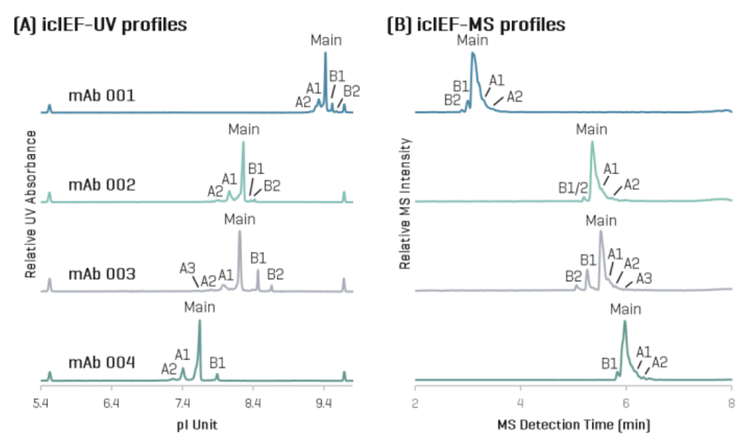- A single icIEF -UV/MSplatform method was employed to characterize 4 mAb standards spanning a pI range of 7.3 to 9.6, significantly reducing method development time while maintaining the flexibility for future optimization tailored to specific samples