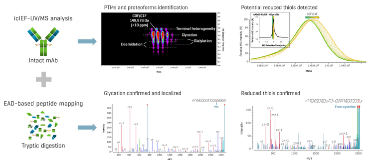 - icIEF-UV/MS analysis and EAD-based peptide mapping allow comprehensive mAbs characterization, with detection of proteoforms at the intact protein level, followed by confirmation and localization of modifications at the peptide level