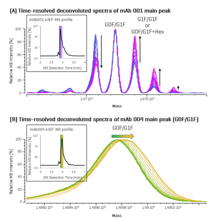 Glycation events were detected in all 4 samples. mAb 001 is presented as a representative example (Figure 5A) to demonstrate the identification of glycation events directly by icIEF -UV/MS analysis, without the need for deglycosylation treatment. The time-resolved deconvoluted spectra showed that, with acidic pI shift (from blue to pink), the intensity of the G1F/G1F signal relative to G0F/G1F signal increased. If this signal corresponded solely to the G1F/G1F glycoform, its relative intensity would not be expected to increase with acidic shift. By monitoring changes in the relative abundance of these glycoforms across the main peak, glycation could be confidently identified without the need for deglycosylation. Additional modifications observed in the acidic region included up to 2 sialic acid additions (+NeuAc) and potential deamidation events, as indicated by corresponding pI shifts.