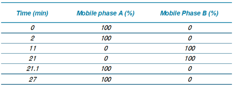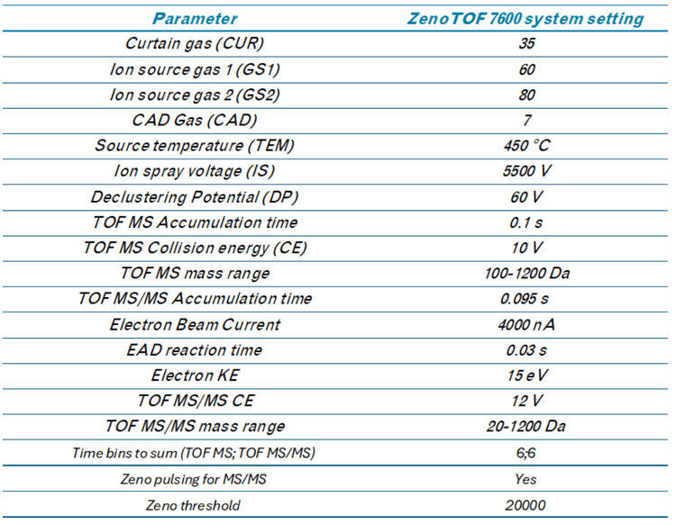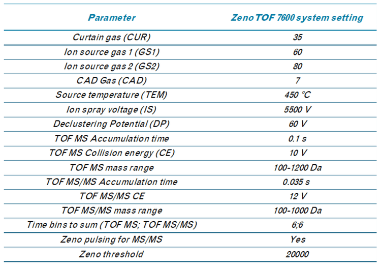 Chromatography: Extracts were analyzed on a ZenoTOF 7600 system using an Exion UHPLC. Samples were separated with a Peptide BEH C18 column (150 x 2.1 mm; 1.7 µm, 130 A, Waters, P/N:186003687). Chromatographic gradient details are shown in Table 1. The autosampler and column oven temperatures were 15 °C and 70 °C, respectively. The mobile phase flow rate was 0.5 mL/min, and the total run time was 27 min. Mobile phases A and B consisted of 10 mM ammonium acetate in water/MeOH/ACN (15/30/55; v/v) and 10 mM ammonium acetate in ACN/MeOH (60/40; v/v), respectively