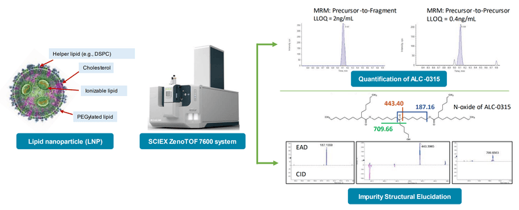In this technical note, the ZenoTOF 7600 system was used to sensitively quantitate the ionizable lipid ALC-0315 and structurally elucidate its related impurities from lipid nanoparticles (LNPs) in plasma. Due to its inherent sensitivity, a triple quadrupole mass spectrometer (TQMS) is typically used for targeted bioanalytical quantitation. However, collision-induced dissociation (CID)-based lipid fragmentation is insufficient for their complete structural characterization. The ZenoTOF 7600 system is capable of sensitive, targeted quantitation and can utilize a complimentary fragmentation mode (electron-activated dissociation; EAD), which is effective for confident metabolic identification (MetID) (1-3) and the structural elucidation of lipids (4-9), thereby adding unique value for analytical versatility.