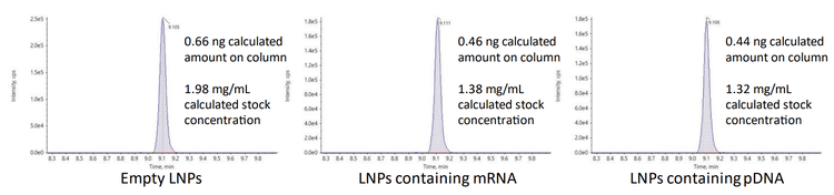 The amounts of ALC-0315 from three different preparations of LNPs diluted into plasma were measured to assess the quantitative performance of the ZenoTOF 7600 system. The LNPs were initially formulated with mRNA, pDNA, or they were empty. The peak areas of the ALC-0315 detected from these LNP preparations diluted 1:6000 are shown in Figure 5. The concentrations of ALC-0315 from 3 LNP preparations were calculated as 0.33, 0.23, and 0.22 mg/mL, based on the external calibration curve from Figure 4. These measurements estimated the original stock concentrations to range from 1.32 to 1.98 mg/mL by extrapolation. This is consistent with the amount of ALC-0315 initially used in the LNP formulation, allowing for some moderate sample loss, where 20-50% lipid loss from filtration (e.g., dialysis) is typical (14-15). A dilution of 1:6000 was 1000x higher than the LLOQ, demonstrating the sensitivity of the ZenoTOF 7600 system. Overall, this method is suitable for measuring trace amounts of material for thorough and sensitive biodistribution assessments.