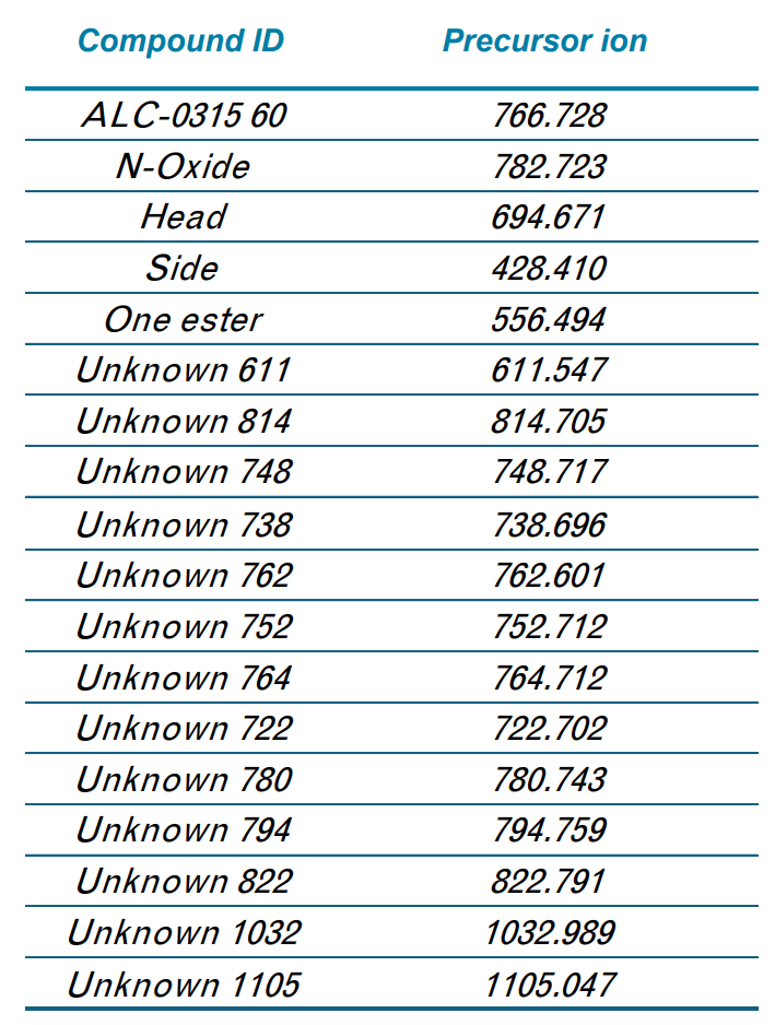- Yang Z, Baker P, Mollah S, Proos R, Le Huray J. Structural characterization of the cationic lipid nanoparticle component, ALC-0315, and its impurities using electron-activated dissociation (EAD)-based MS/MS fragmentation. SCIEX technical note, RUO-MKT-26966-A
