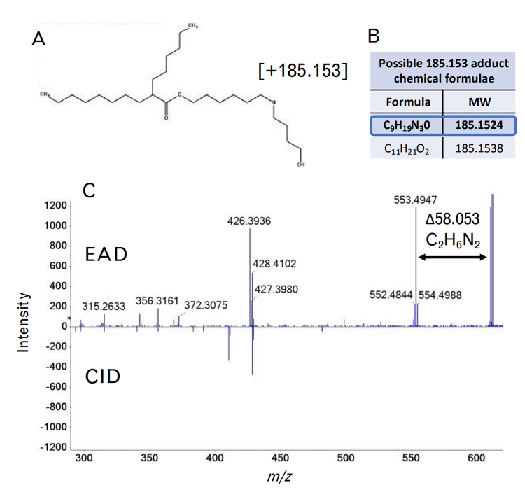 A more complex unknown impurity at m/z 610.540 was also observed. This molecular weight is consistent with the loss of one of the hexane-6,1-diyl bis(2-hexyldecanoate) (C22H44O2) chains, and the addition of an unknown covalent addition with a molecular weight of 185.153 (Figure 8A). This molecular weight could be explained by two different chemical formulae based solely on MS accurate mass – C9H19N3O or C11H21O2, as shown in Figure 8B. Fragmentation by EAD resulted in a unique fragment of m/z 553.494 not seen by CID, which was 58.053 mass units less than the precursor molecular weight (Figure 8C). This loss could only be explained by a nitrogen-containing chemical formula of C2H6N2 due to accurate mass measurement and the mass defect of molecular nitrogen. In addition, fragment ions matching losses relating to the chemical formulae of C8H19N2 and C9H21N2 were also observed in the EAD fragment ion spectrum. As a result, the adducted chemical formula was narrowed down to C9H19N3O. Although it is difficult to derive the exact structure of this adduct, these data show that EAD provides valuable information that is not attainable by accurate mass measurements or by CID alone. This information could help corroborate the elucidation of other unknown lipid-adducted species from oligonucleotide or protein modifications.