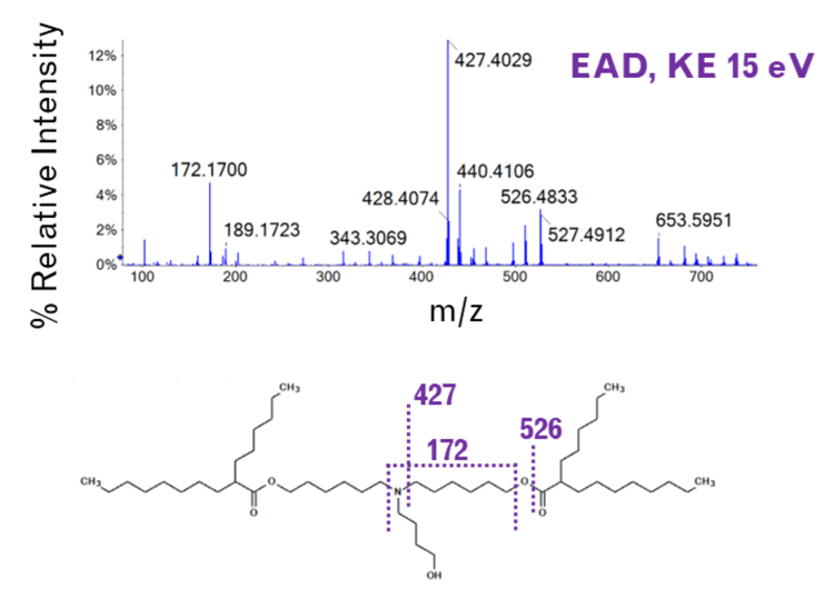 With the administration of novel exogenous materials, like the ionizable lipids used in LNPs, it is necessary to track their biodistribution and metabolism products to assess their safety and efficacy profiles. TQMSs are used for quantification studies to support bioanalytical assays using an MRM approach. However, some lipids may not fragment well by traditional CID fragmentation techniques nor produce diagnostic product ions to distinguish them from other interfering ions within biological matrices. In addition, it can be challenging to identify the structures of compounds formed from degradation or metabolism using a CID-based fragmentation alone. It has been shown that EAD-based fragmentation can produce information-rich spectra that can confidently elucidate structures of ionizable lipids and pinpoint sites of modifications within their related impurity structures (11-13).