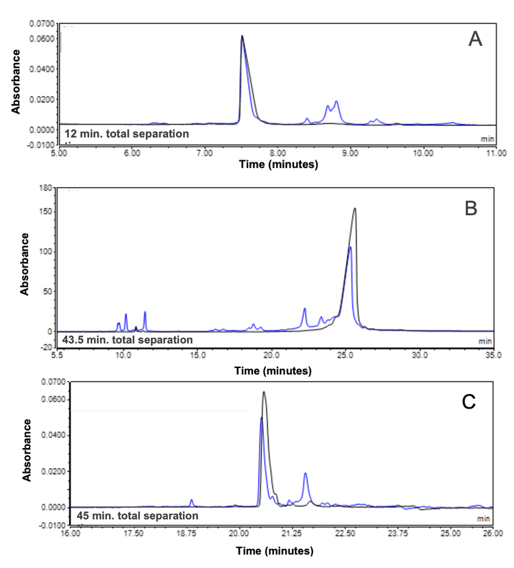 Finally, this CZE method was compared against traditional inhouse cIEF and CEX approaches. An example of Nanobody sample C analyzed using the 3 methods is shown in Figure 4. This comparison (Figure 4) shows that the CZE method can separate and detect charge variants (for example, deamidated species) of a Nanobody sample in less than half the analysis time of the other 2 conventional techniques with very little up-front development time.