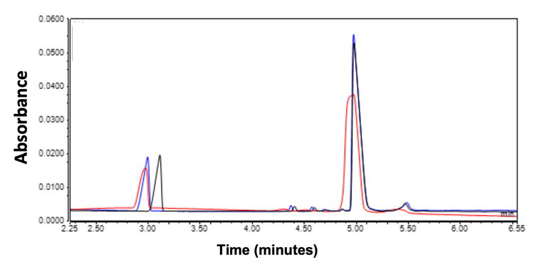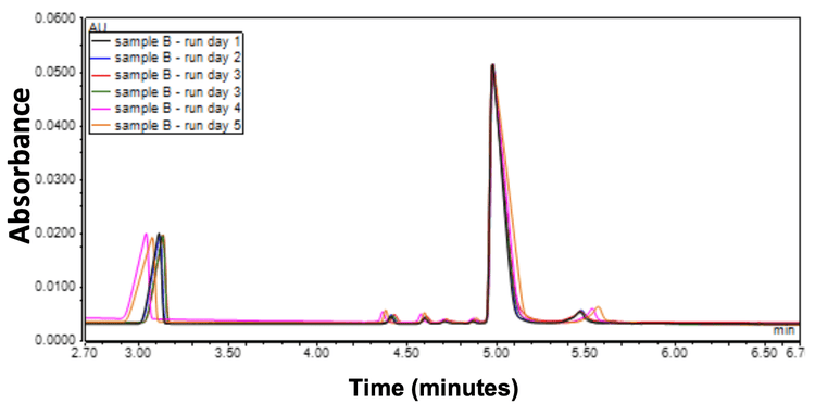 To evaluate the reproducibility of the CZE assay, NANOBODY sample B was injected in 5 different days. The overlaid electropherograms demonstrate consistent results across the days (Figure 3).