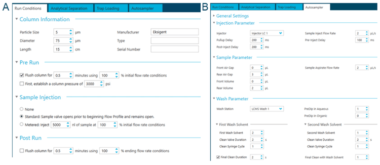 The M5 microflow LC system is integrated with SCIEX OS software to allow users to control LC parameters in a single streamlined and user-friendly interface. In the LC method module, users can view and control the instrument run conditions (Figure 4A), analytical separation and trapping gradients (Figures 3A and 3B) and autosampler parameters (Figure 4B).