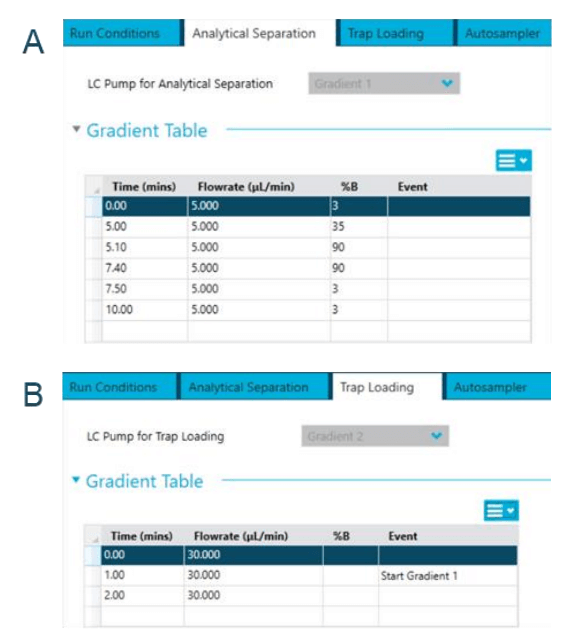 SCIEX OS software was used to create the microflow LC methods, including the gradients for analyte separation (Figure 3A) and trapping (Figure 3B).