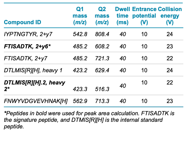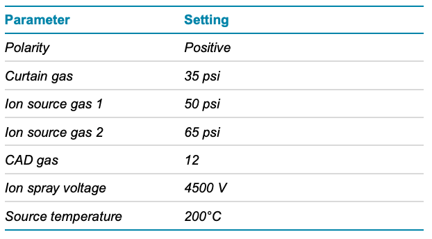 Mass spectrometry: A SCIEX 7500 system with an OptiFlow Pro ion source with an E Lens probe and a micro (low) electrode was used in positive MRM mode. The MRM transitions and optimized analyte-dependent MRM parameters used are listed in Table 2. The optimized source and gas parameters used are listed in Table 3.
