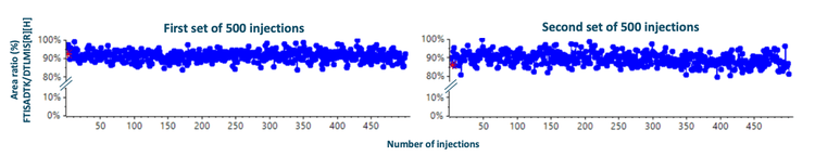 - Robust microflow LC-MS/MS workflow: Robustness was demonstrated over 1000 consecutive injections with a %CV <3.8% for the peak area ratio stability and retention time precision of <1% for both sets of injections