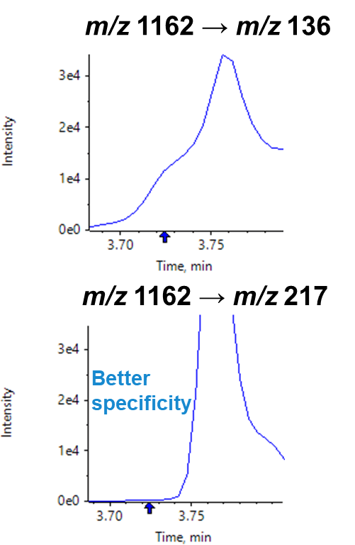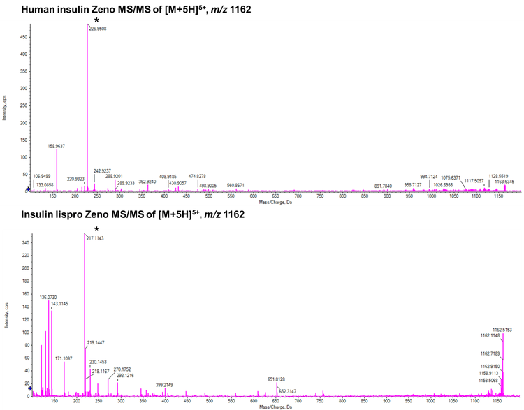Since human insulin is often encountered as an endogenous interference, CID was employed to differentiate insulin lispro from human insulin. As shown in Figure 2, human insulin and insulin lispro are differentiated using m/z 226 and m/z 217, respectively. Both y2 fragments arise from the last 2 amino acids in the B chain (Figure 1). For human insulin, fragment m/z 226 is composed of proline and tyrosine while for insulin lispro, fragment m/z 217 is composed of lysine and tyrosine.