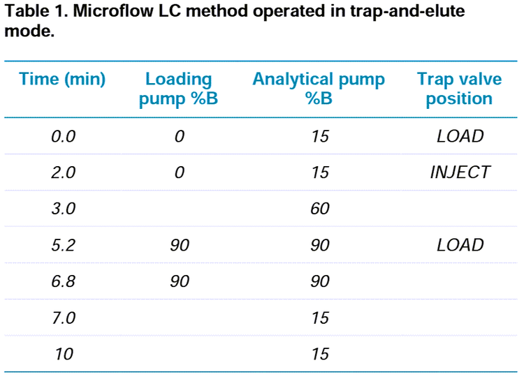 Gradient conditions are summarized in Table 1. For analyte trapping, the operating flow rate was set to 50 µL/min using a Phenomenex Luna C18(2) column (20 x 0.3 mm, 5 µm, 100 Å). The column was operated at room temperature.