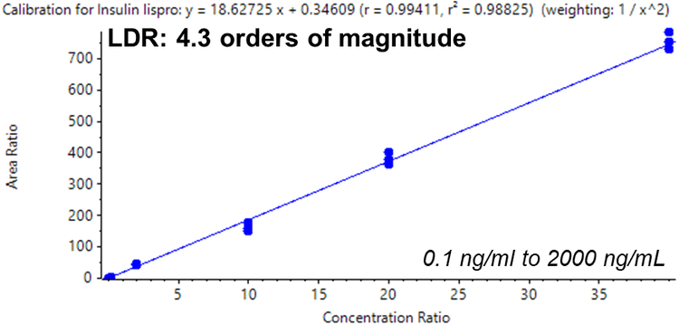 - Low-level LLOQ for quantification of insulin lispro was achieved with GLP accuracy, precision and wide linearity up to 4.3 orders of magnitude