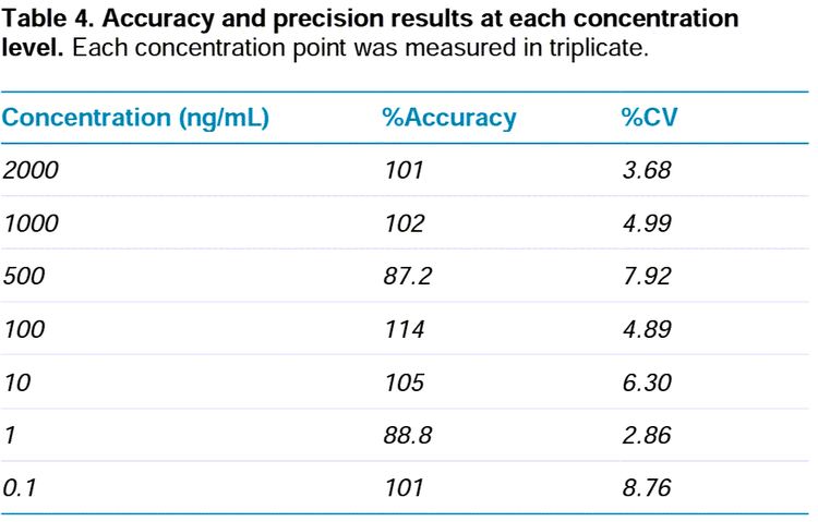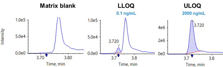 As shown in Figure 4, the LLOQ for insulin lispro was determined to be 0.1 ng/mL. No matrix interferences were observed in the blank. The upper limit of quantification (ULOQ) was determined to be 2000 ng/mL.
