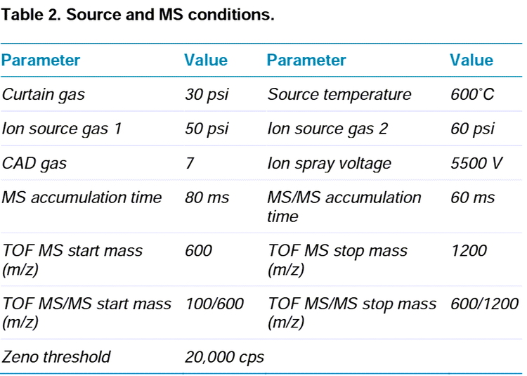 Precursor and fragment masses of the peptides used for quantification are listed in Table 3. XIC peak width of 0.04 Da was applied for processing the Zeno MS/MS data.