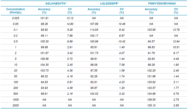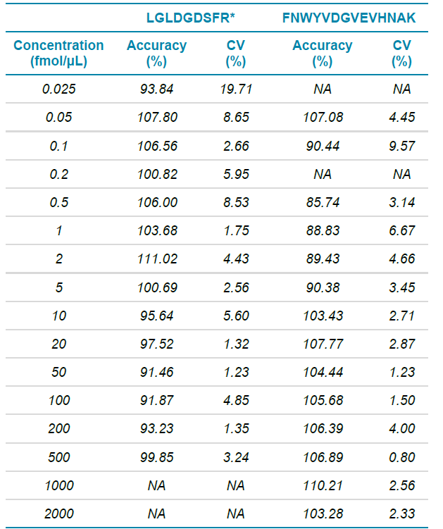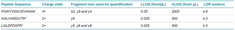 - GLP-level accuracy and precision for signature peptide quantification was achieved with greater than 4.3 orders of magnitude in LDR.