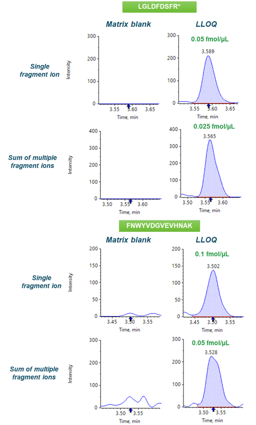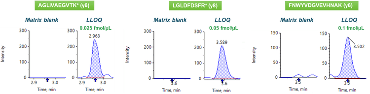 LLOQs of 0.025 fmol/µL, 0.05 fmol/µL and 0.1 fmol/µL were achieved for peptides AGLIVAEGVTK*, LGLDFDSFR* and FNWYVDGVEVHNAK, respectively (Figure 2). No interferences were observed in the matrix blank.