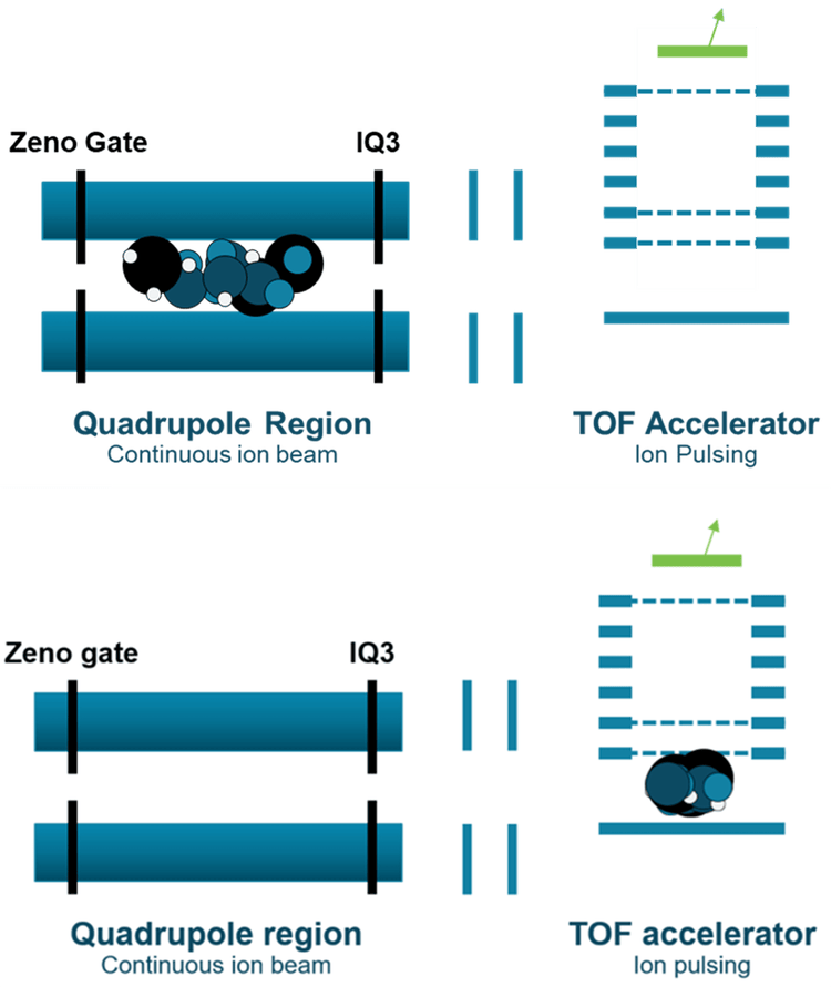 In traditional TOF MS/MS acquisition, ions are lost between TOF MS spectra acquisitions, resulting in a much lower MS/MS sampling efficiency and sensitivity than MRM on a triple quadrupole mass spectrometer. The Zeno trap increases ion transmission by providing control of the ion beam from the collision cell into the TOF accelerator (Figure 1).