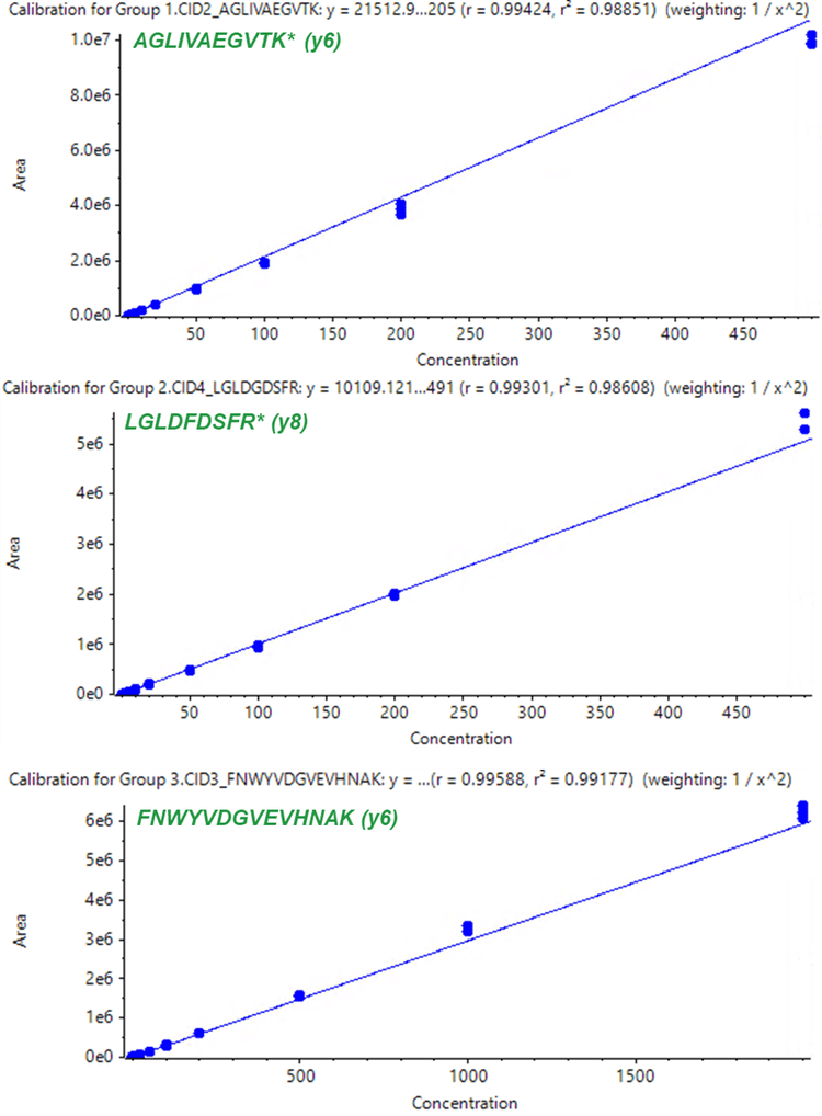 FNWYVDGVEVHNAK, AGLIVAEGVTK* and LGLDFDSFR* were used as model peptides to evaluate the quantification of signature peptides on the ZenoTOF 7600 system. The peptides were spiked into processed rat plasma at concentrations ranging from 0.025 fmol/µL to 2000 fmol/µL.
