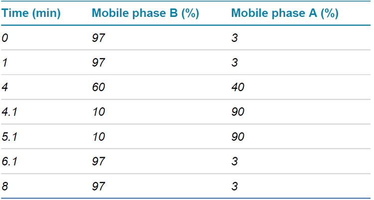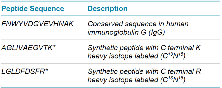 Sample preparation: Plasma proteins were precipitated with cold methanol. After centrifugation, the supernatant was discarded while the pellet was solubilized in 200 mM ammonium bicarbonate in 10:90 (v/v) methanol/water. Digestion was performed using trypsin. After 1 hour at 60°C, the solution was acidified by adding formic acid.5 The digested plasma was diluted by 200x using 5:1:94 (v/v/v) acetonitrile/formic acid/water. Synthesized peptides (Table 2) were spiked into the digested plasma solution and followed by serial dilution in the matrix. The final injection volume was 10 µL.