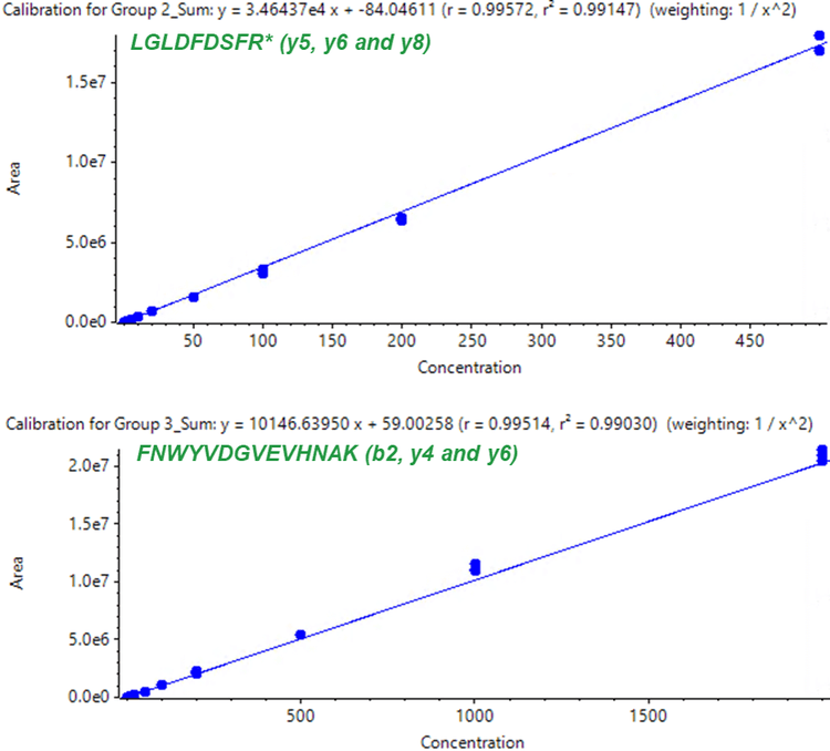 The linear range for the multiple fragment ion approach covered concentrations from 0.025 fmol/µL to 2000 fmol/µL (Figure 4). Strong linearity was observed for each of the calibration curves with an LDR of greater than 4.3 orders of magnitude.