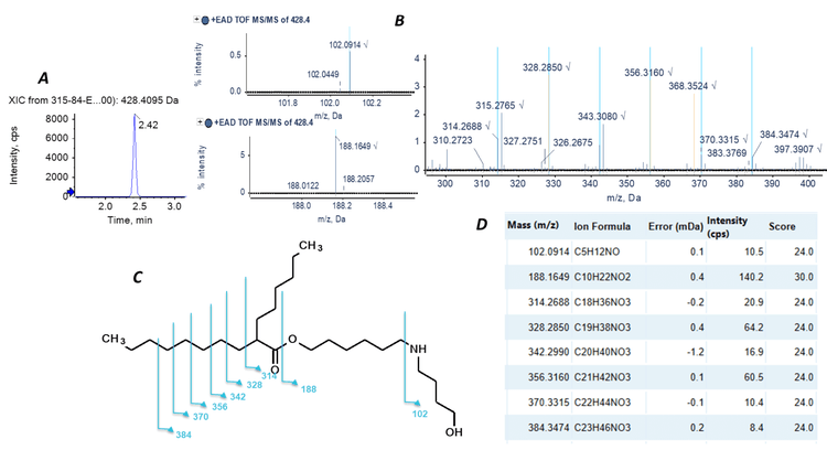 Molecule Profiler software elucidated the structure of lowabundance impurities with high confidence, leveraging the sensitivity gained by the Zeno trap and the information-rich EAD MS/MS spectra. Figure 5 shows the structural elucidation of an impurity (m/z = 428.4) with only 0.01% abundance in the sample from Vendor 3. In addition to the signature ions m/z values of 102.1 and 188.2 for definitive structural elucidation, EAD induced a series of C-C bond breaking, indicating the thorough structural analysis of singly charged ionizable lipids.