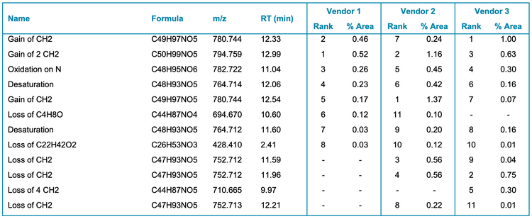 Molecule Profiler software automatically identified several impurities in samples from the 3 vendors. These results are summarized in Table 4, including their relative abundance peak areas and abundance rank within each vendor based on TOF MS peak areas. The type and abundance of impurities varied across the 3 vendors. For example, a methylated impurity eluting at RT 12.3 min showed relative abundances of 0.24%, 0.46% and 1% in the samples acquired from Vendors 2, 1 and 3, respectively. Whereas the loss of 4 CH2 was a common impurity in the sample from Vendor 3, this impurity was not observed in the samples from Vendors 1 or 2. The ability of this workflow to capture such variation in impurity content between the samples will provide a streamlined solution for lipid raw material control.