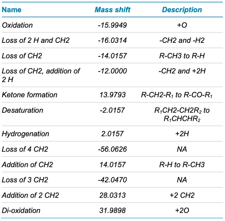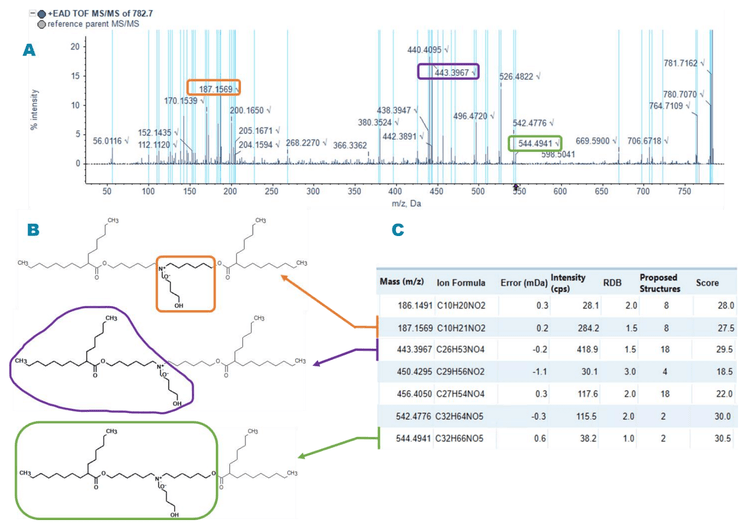 Confirming the structure of identified impurities relies on information attained by the MS/MS data. EAD can provide an indepth characterization of singly charged ionizable lipids.4,5 The Molecule Profiler software interpretation workspace capitalizes on the information-rich MS/MS spectrum to facilitate the automatic structural elucidation and localization of chemical alteration sites.