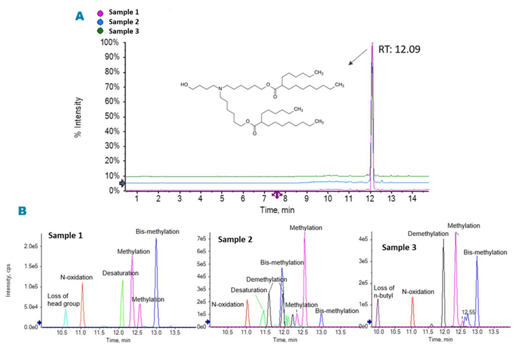 Sample preparation: Samples of ALC-0315 from 3 different suppliers were provided by Acuitas Therapeutics. Stock solutions of the 3 ionizable lipids were diluted 100-fold using mobile phase B and then were further diluted 100-fold using mobile phase A. Mobile phase B was 60:40 (v/v), acetonitrile/MeOH with 10mM ammonium acetate. Mobile phase A was a solution containing by volume 15% water, 30% MeOH and 55% acetonitrile with 10mM ammonium acetate. The resulting samples were analyzed directly by UPLC-MS/MS.