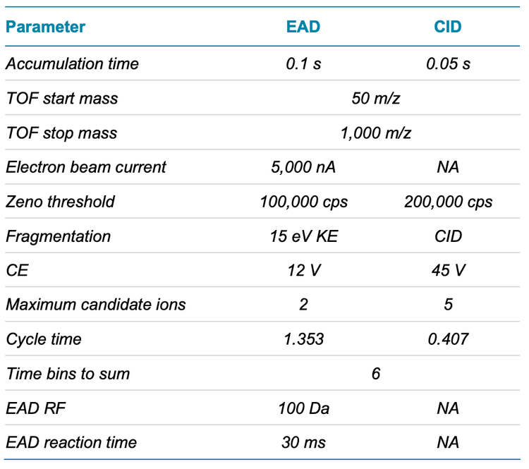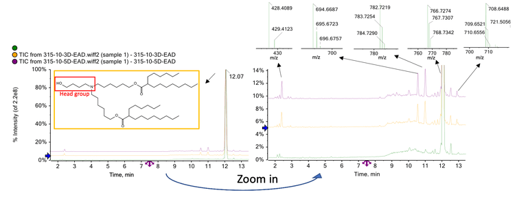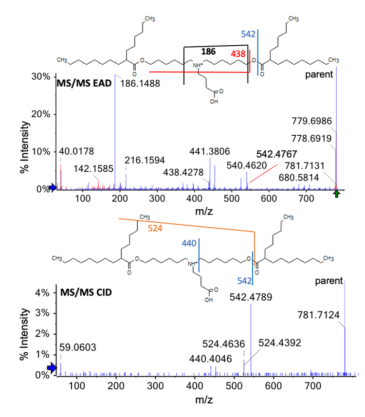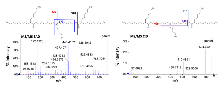 The use of lipid nanoparticles (LNP) as drug delivery devices has dramatically increased since the advent of the COVID-19 vaccine and introduction of recent gene therapy therapeutics. Lipid impurities in the LNP can attenuate the effectiveness of the active pharmaceutical ingredient (API). For example, N-oxidation of ionizable lipids might lead to covalent modification of ribonucleotides and a loss of mRNA potency. 1 It is therefore necessary to ensure detailed and sensitive characterization of the ionizable lipid and its related impurities. However, detailed characterization of LNPs is challenging using current liquid chromatography-mass spectrometry (LC-MS) methodologies. EAD can be used to provide structurally diagnostic fragment ions to elucidate the distinctive structures of complex lipids. 2-8
