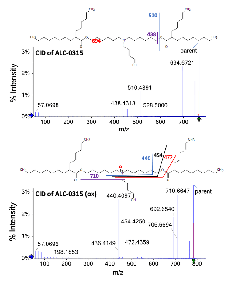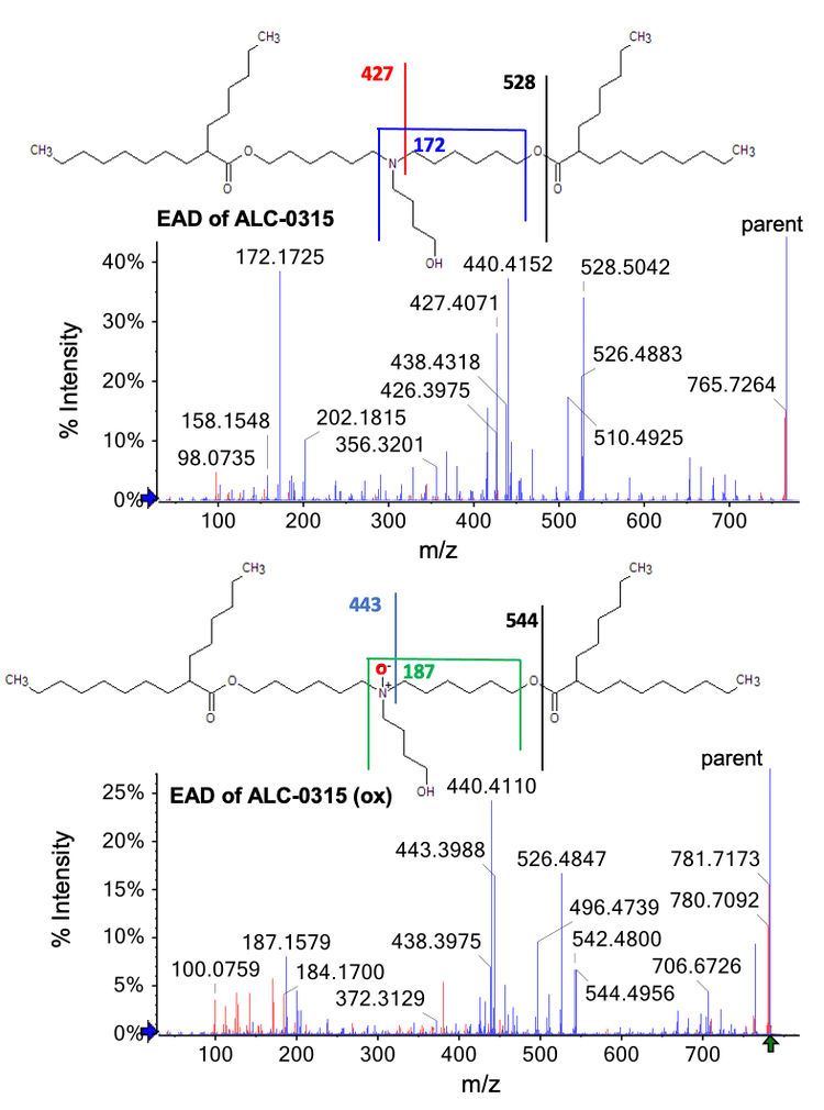 The intensity of this peak increased with the forced degradation timecourse (Figure 2, right). Figure 4 shows the EAD fragmentation spectra for ALC-0315 and the unknown oxidation product. The peak at m/z 544.4956 (Figure 4, bottom) from oxidized ALC-0315 is 15.9914 Da more than the m/z 528.5042 (Figure 4, top) fragment from intact ALC-0315. This observation indicates that O was incorporated to the left of the ester bond. Similarly, the peak at m/z 443.3988 (Figure 4, bottom) from the oxidized ALC-0315 is 15.9917 Da more than the peak at m/z 427.4071(Figure 4, top) from the intact ALC-0315, which indicates the addition of that O was added to the left of the C-N bond. Finally, the addition of 14.9854 Da (187.1579 (Figure 4, bottom)-172.1725 (Figure 4, top) = 14.9854) corresponds to the gain of one O and loss of H on the head group N atom.